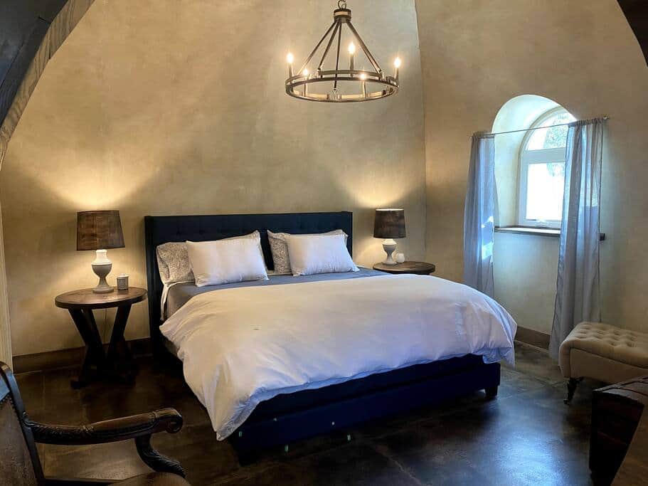 Inspired by Sam Gamgee — carefully crafted and elegantly appointed. A cozy loveseat by the wood stove, a sleigh bed with sheer canopy, travertine mosaic bathroom and reclaimed buffet kitchenette bring Middle-earth to life. Check-in 4PM · Check-out Noon.